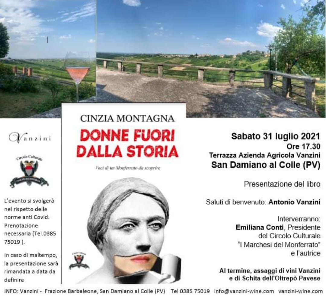 Il libro “Donne fuori dalla storia“, dell’autrice Cinzia Montagna, farà tappa a San Damiano al Colle (PV), il giorno 31 luglio 2021, sabato, alle ore 17.30, nella suggestiva terrazza dell’azienda Agricola Vanzini, in frazione Barbaleone.