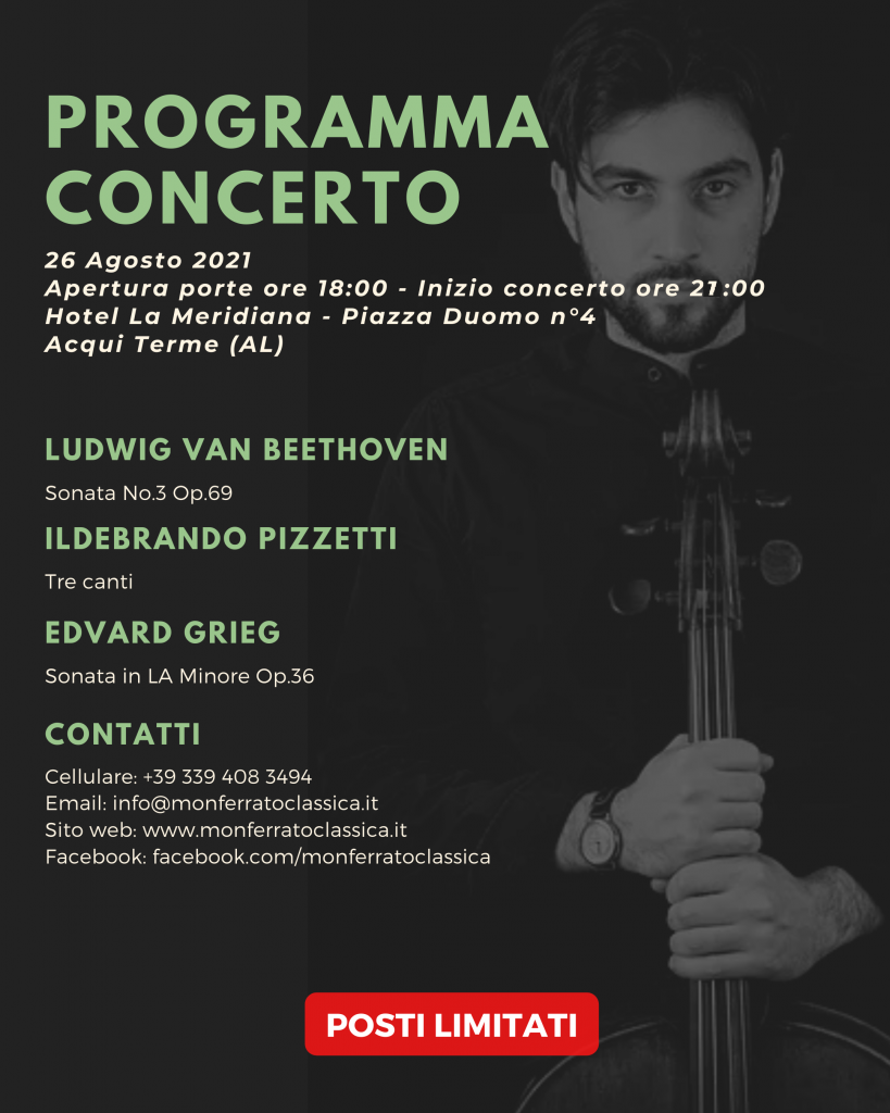 Alle ore 21.00 di giovedì 26 agosto 2021 avrà luogo, presso l’Hotel Meridiana di Acqui Terme, in piazza Duomo nr. 4, l’esibizione musicale inserita nel Monferrato Classica Chamber Music Festival 2021, eseguita dall’artista Amedeo Cicchese: da non perdere!!!!
